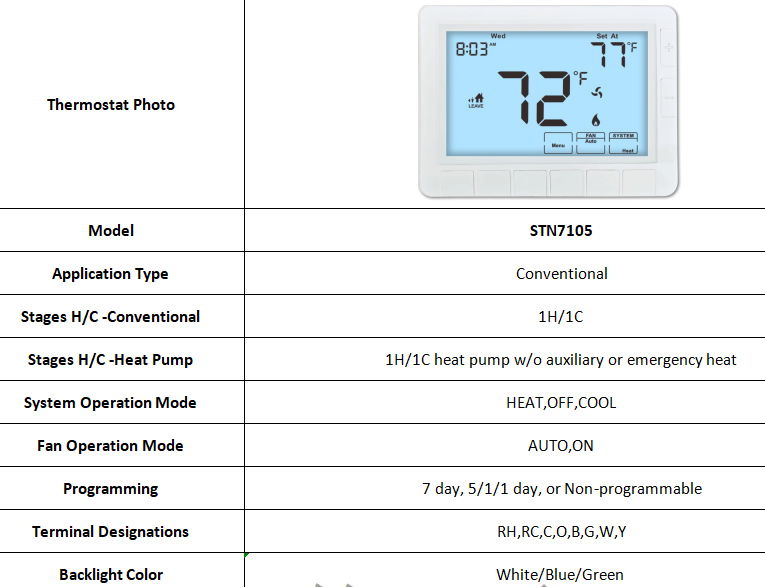 STN7105 به عنوان یک کنترلگر ترموستات دیجیتال متنوع، سازگار با سیستم های گرمایش و خنک سازی معمولی عمل می کند.از یک پیکربندی پمپ گرما 1H / 1C بدون گرمای کمکی یا اضطراری پشتیبانی می کند، که آن را به یک گزینه ترموستات موتور کارآمد برای تنظیمات مختلف HVAC تبدیل می کند.