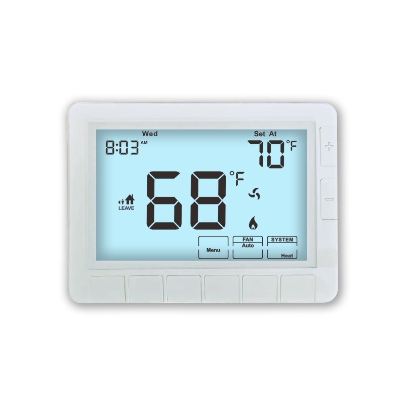 ترموستات اتاق الکترونیکی با تمرکز بر قابلیت استفاده و نمایش اطلاعات واضح ، دارای اندازه صفحه نمایش بزرگ 8.18 اینچ مربع است.این منطقه گسترده صفحه نمایش آسان برای خواندن مقادیر دمای و شاخص های وضعیت سیستم را فراهم می کند، اطمینان از اینکه کاربران می توانند تنظیمات را به سرعت و دقیق کنترل و تنظیم کنند. رابط کاربری بصری برنامه نویسی ترموستات و عملکرد روزانه را ساده می کند،در دسترس قرار دادن آن برای کاربران با تمام سطوح تجربهچه برای کنترل ترموستات گرم کننده گاز خانگی و چه برای کنترل گرم کننده الکتریکی صنعتی در یک تاسیسات تجاری، نمایش شفاف تجربه کلی کاربر را افزایش می دهد.